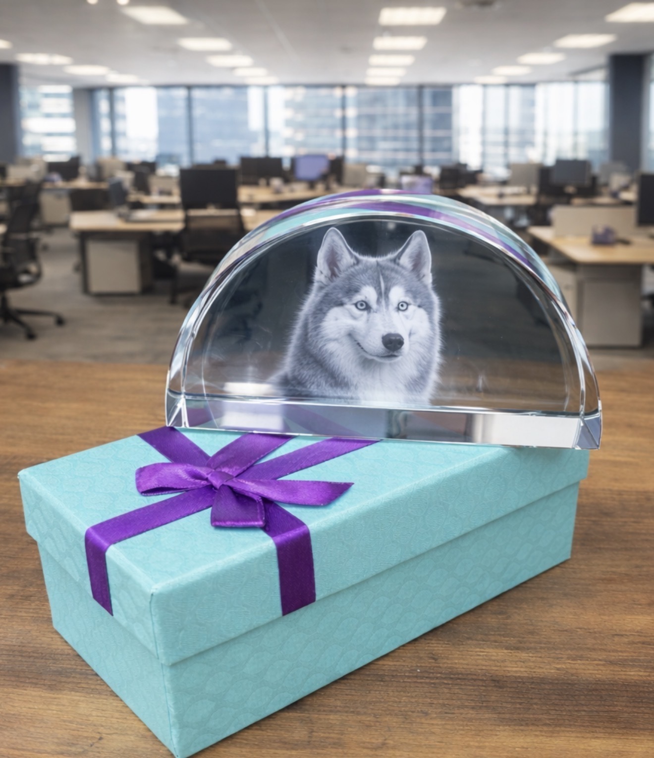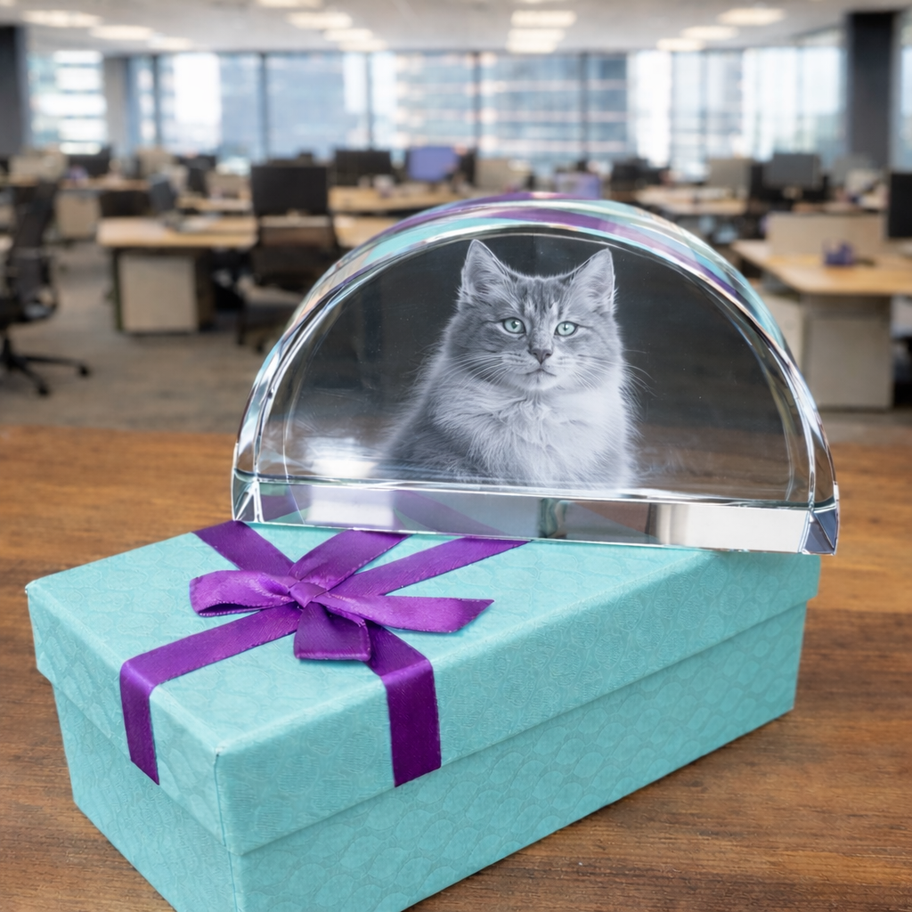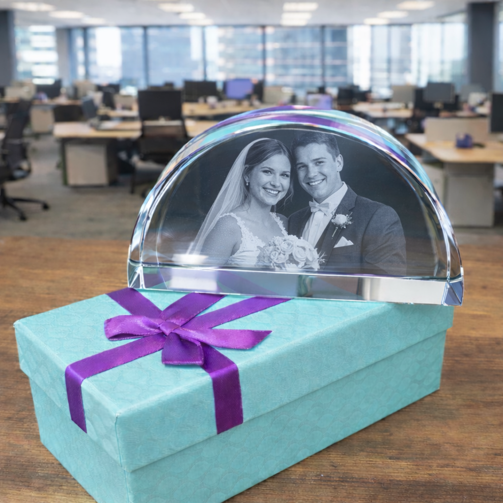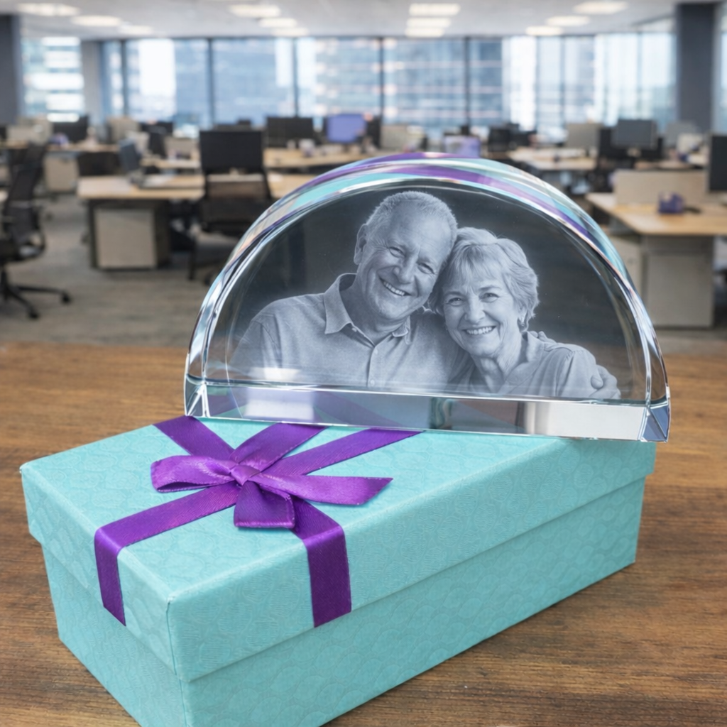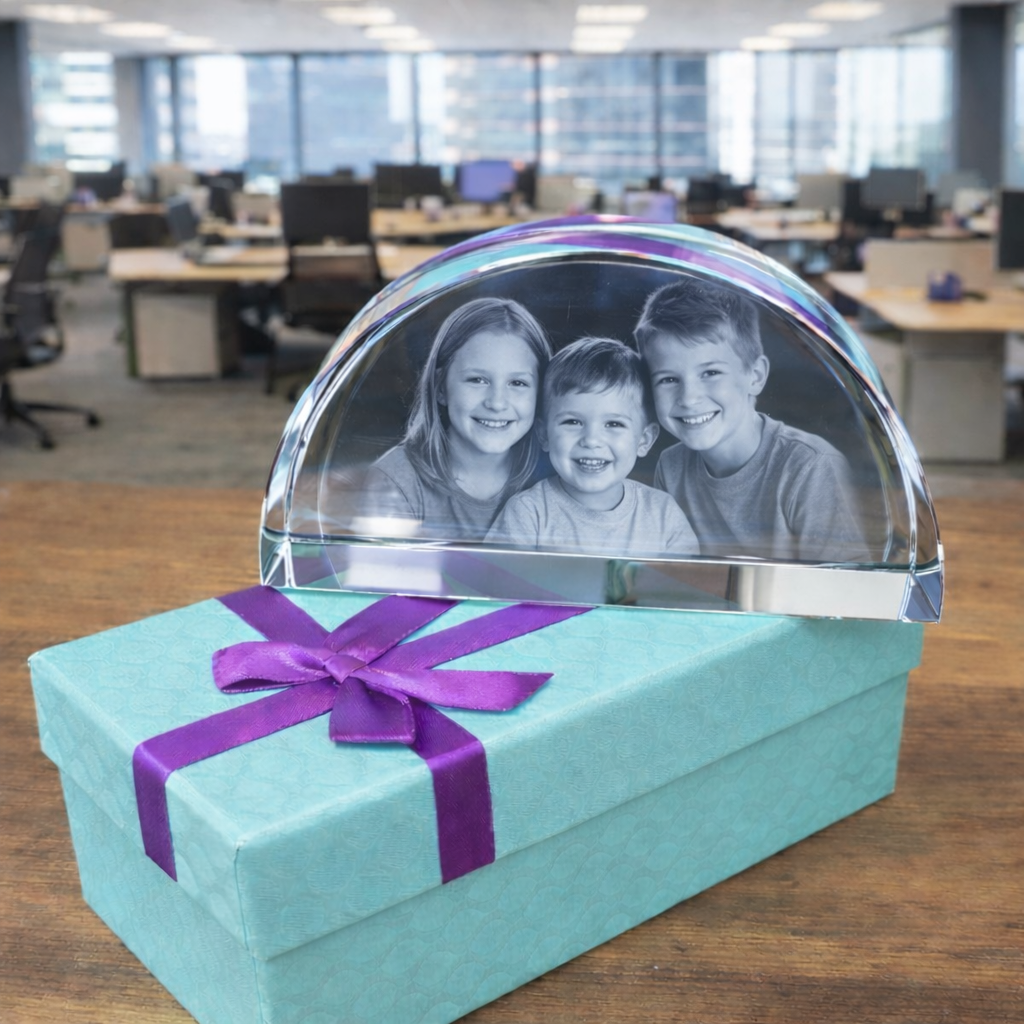 Expertly laser-engraved using advanced 3D technology, your photo is transformed into a lifelike volumetric engraving suspended inside the crystal — visible from the front and subtly from the sides. The smooth curved top and solid flat base give this crystal a modern, refined presence, making it perfect for desks, shelves, and display cabinets.