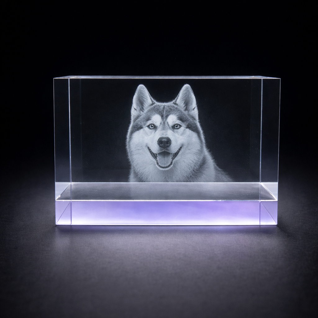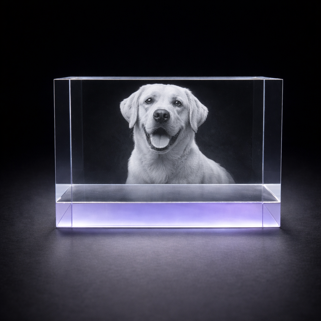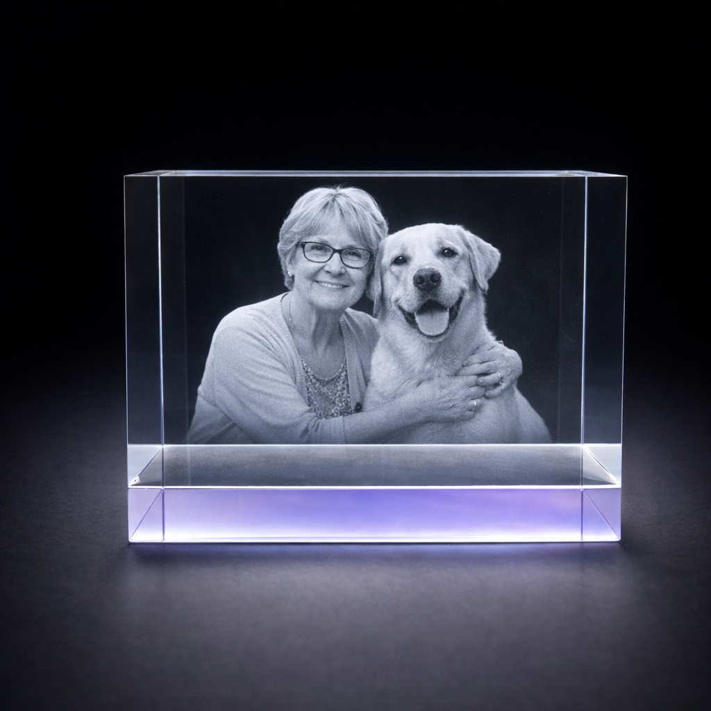 Product highlights: • Premium lilac-tinted optical crystal • Size: 15 × 8 × 8 cm • Approx. 2 kg crystal weight • Suitable for 1–4 people or pets • Portrait or landscape engraving depending on image • Optional LED light base available • Also available in a smaller 12 × 8 × 6 cm size please find this also on the site