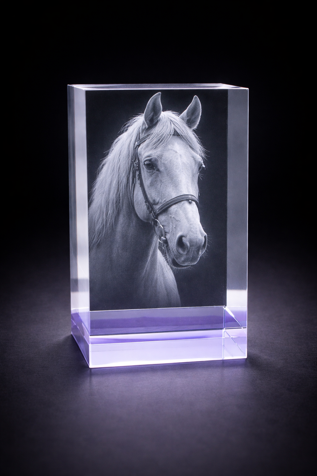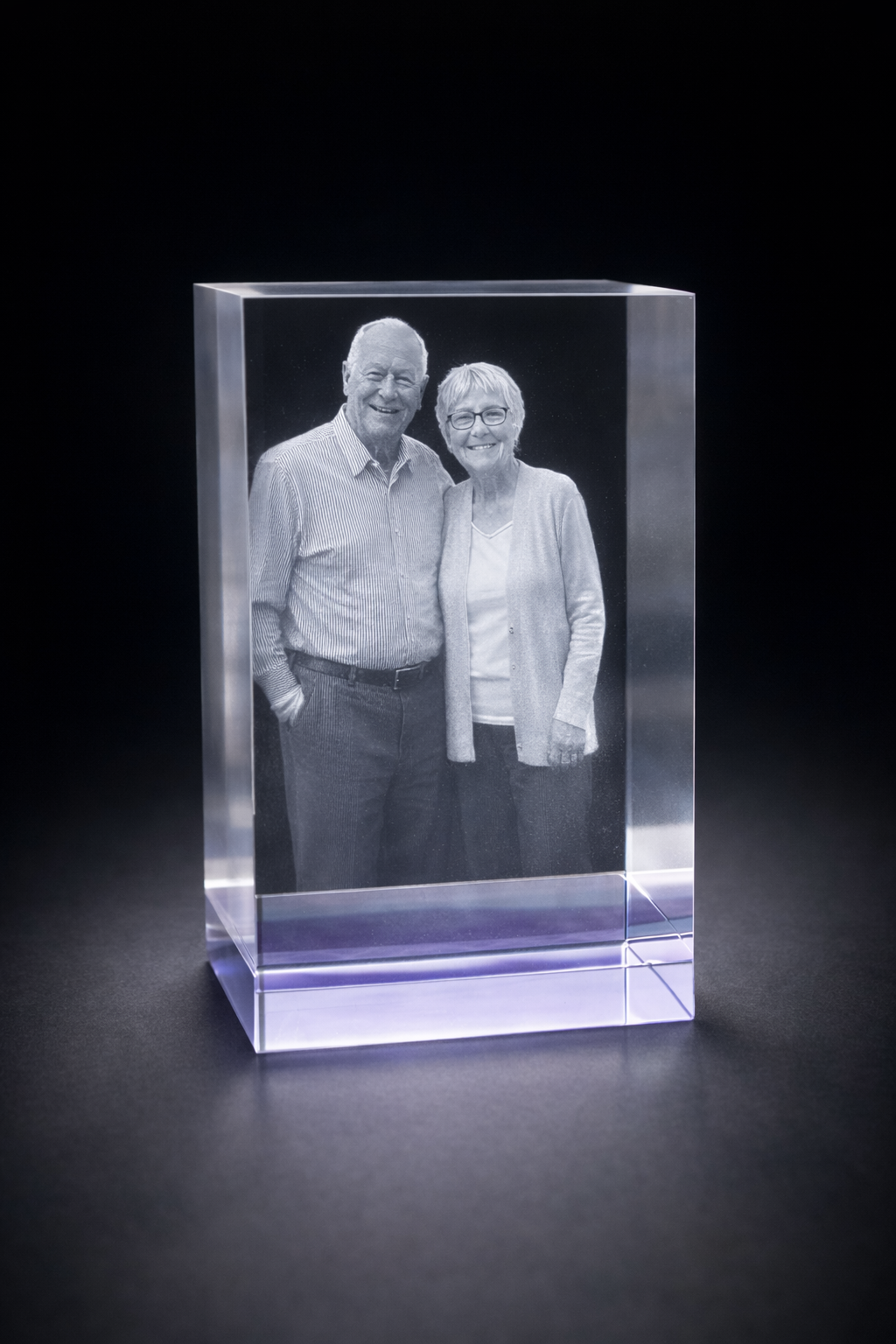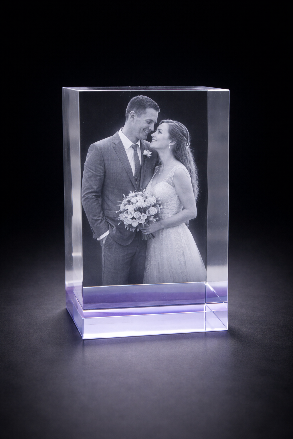 Product highlights: • Premium lilac-tinted optical crystal • Size: 15 × 8 × 8 cm • Approx. 2 kg crystal weight • Suitable for 1–4 people or pets • Portrait or landscape engraving depending on image • Optional LED light base available • Also available in a smaller 12 × 8 × 6 cm size please find this also on the site