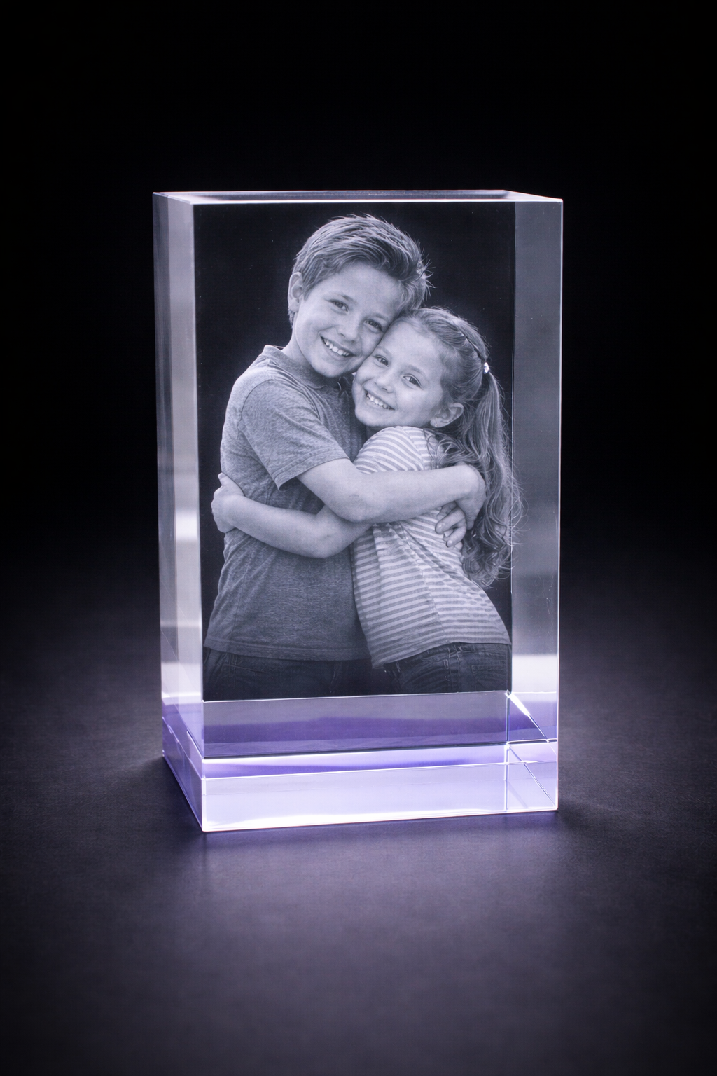 Using advanced laser technology, your photo is transformed into a detailed 3D engraving suspended within the crystal. The larger size of this block allows for increased engraving detail, making it ideal for 1 to 4 people or pets.