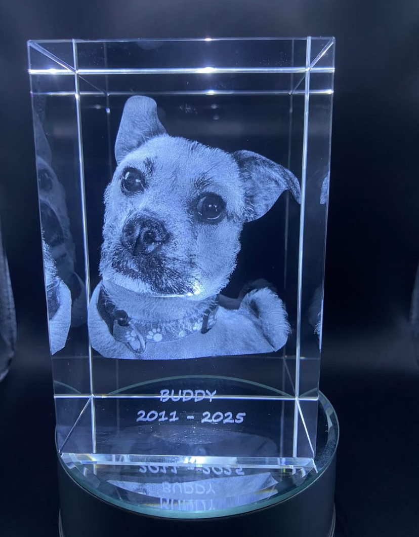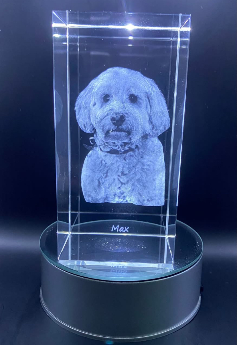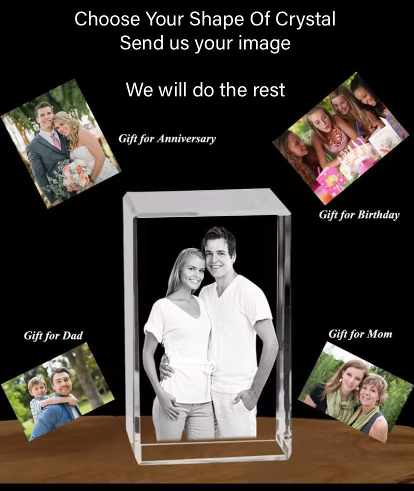 Simply Choose the crystal of your choice corresponding with the amount of persons/pets to be included, upload image, upload any message you would like engraved within. You can add a led light if required, let us do the rest.