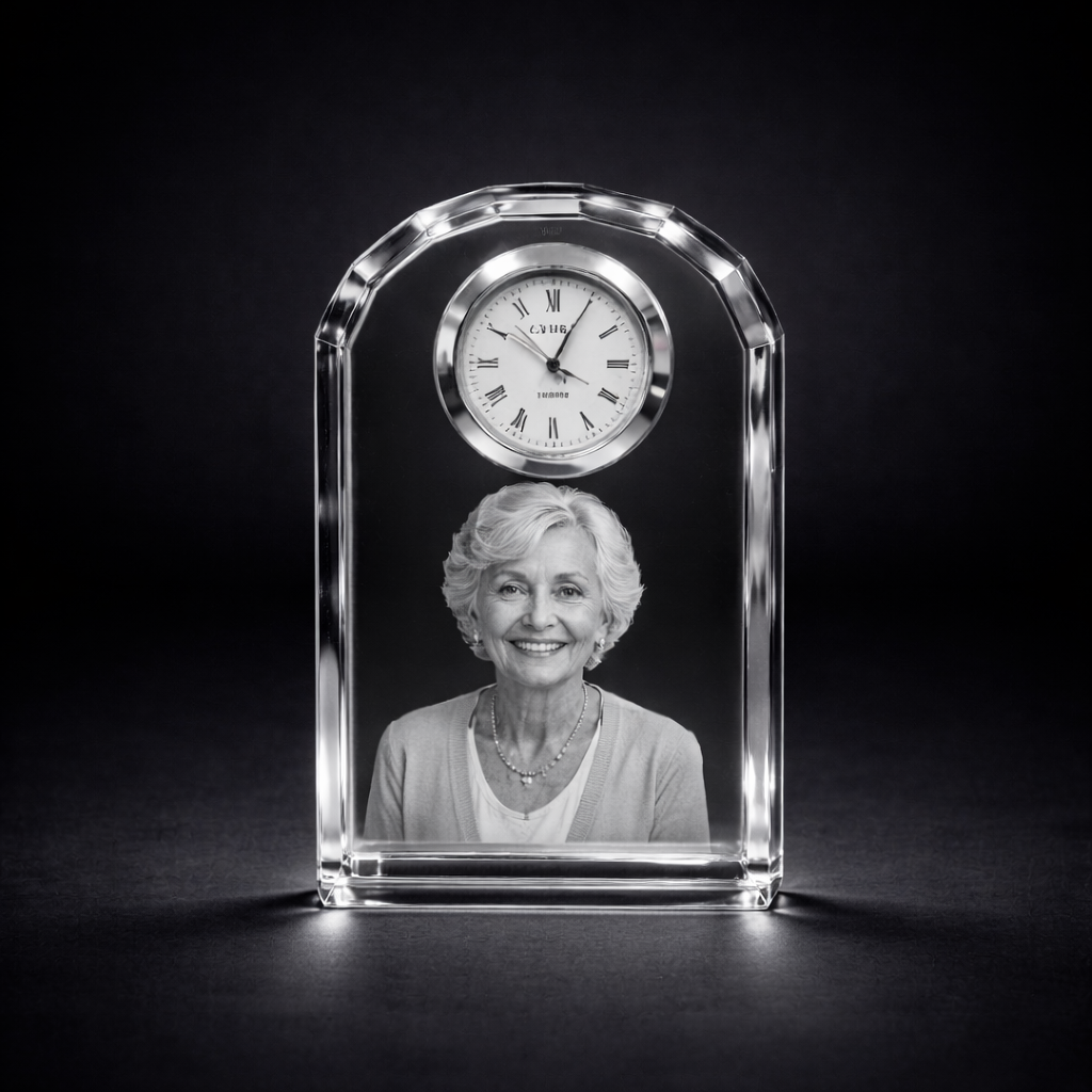 Crafted from premium optical crystal, this stunning keepsake features a precision quartz clock alongside your personalised photo, expertly transformed into a lifelike sub-surface 3D engraving. The image appears suspended within the crystal, creating incredible depth and detail visible from every angle.